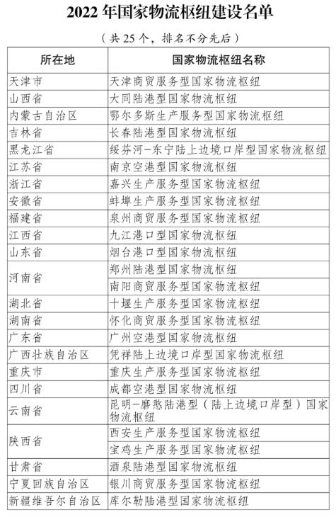 為認真貫徹落實黨的二十大精神,按照“十四五”規(guī)劃《綱要》關于“推進120個左右國家物流樞紐建設”的決策部署,近日國家發(fā)展改革委印發(fā)《關于做好2022年國家物流樞紐建設工作的通知》,將天津商貿服務型等25個國家物流樞紐納入2022年度建設名單。其中,從地區(qū)分布看,東部地區(qū)6個、中部地區(qū)7個、西部地區(qū)10個、東北地區(qū)2個;從樞紐類型看,陸港型5個、空港型3個、港口型2個、生產服務型7個、商貿服務型5個、陸上邊境口岸型2個、陸港型及陸上邊境口岸型合并建設1個。